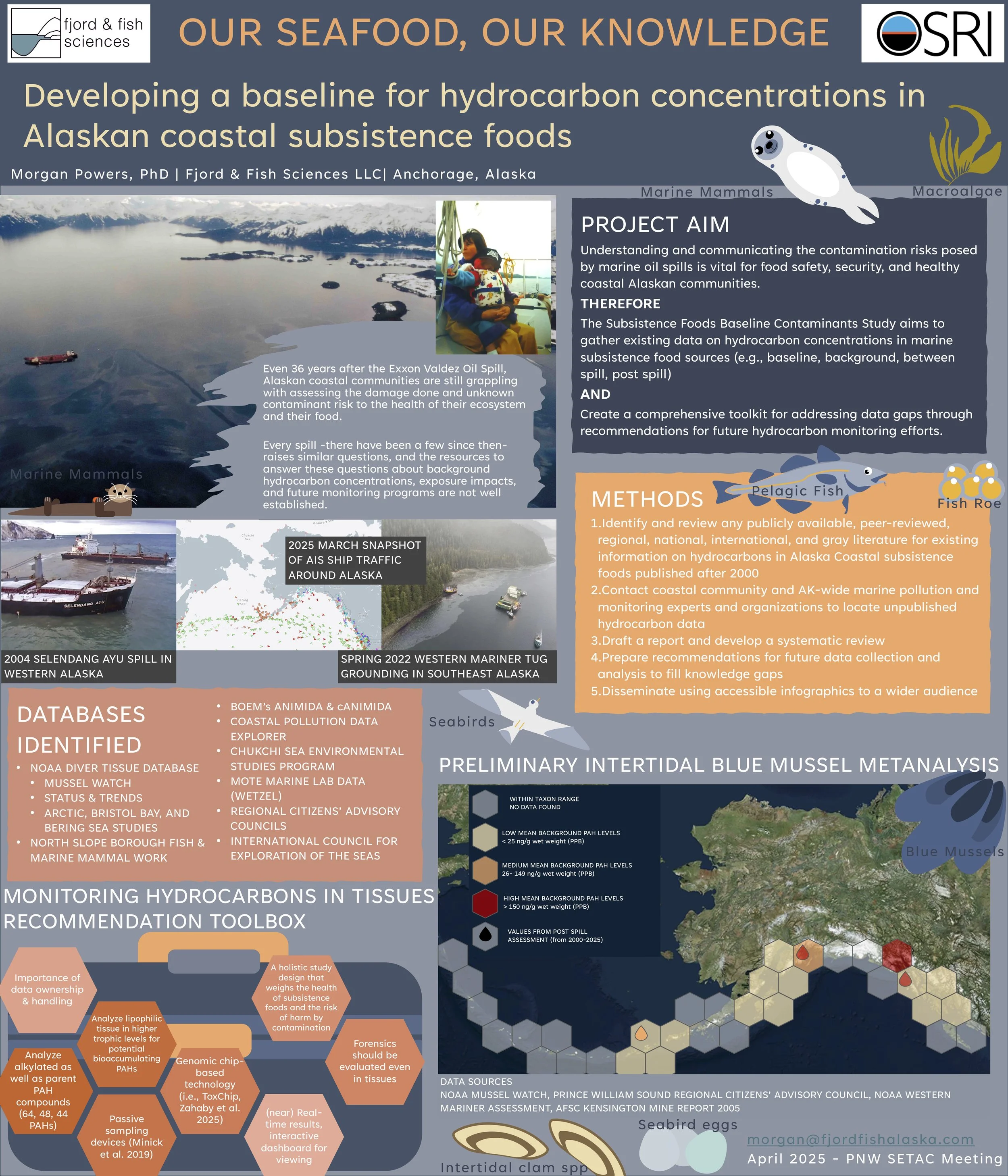 In Alaska, marine fish, shellfish, seabirds, marine mammals, and marine plants are harvested for food, culture, and way of life. However, these same foods face risks from hydrocarbon contamination due to marine oil spills - from disasters like the 1989 Exxon Valdez, 2004 Selendang AYU, and 2022 Tug Western Mariner oil spills.